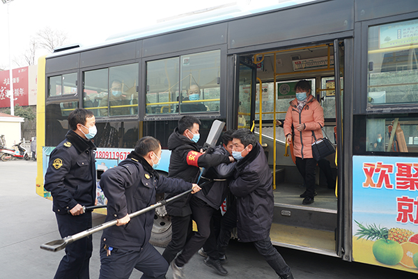 在火車站首末站,恰逢一車隊工作人員正在開展疫情防控應(yīng)急演練,一未佩戴口罩的乘客欲乘車,駕駛員制止后,該乘客非但不聽,強(qiáng)行上車后辱罵、持刀相向駕駛員,駕駛員隨即將情況報告車隊長并報警,車隊安保人員將其制服??赐暄菥毢?,熊衛(wèi)軍、錢萬輝對工作人員面對突發(fā)事件的應(yīng)急處置能力點贊。